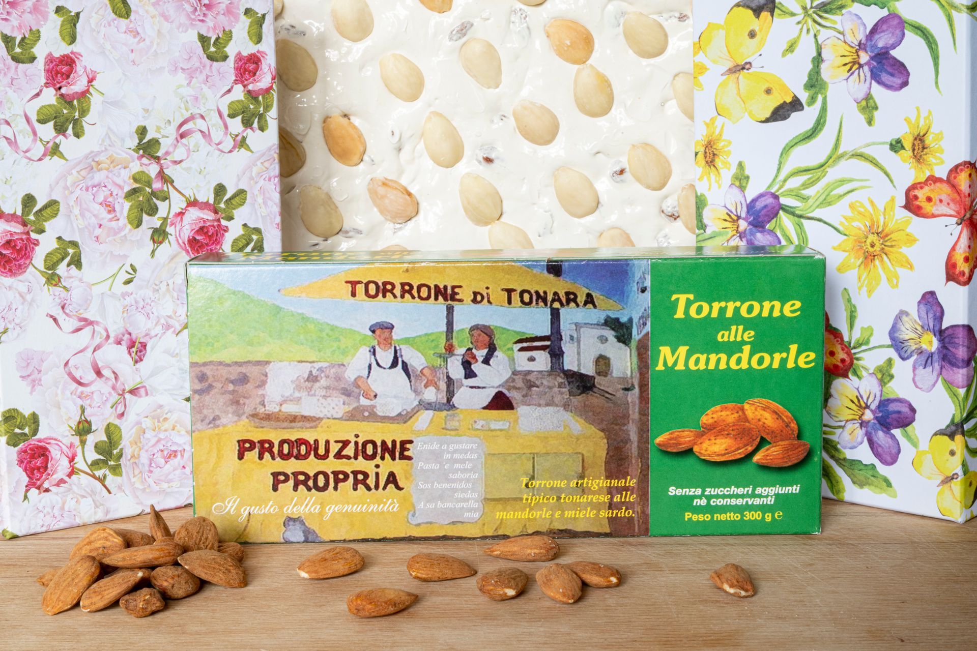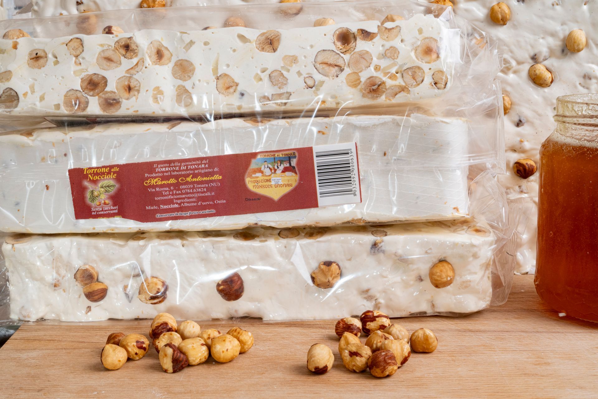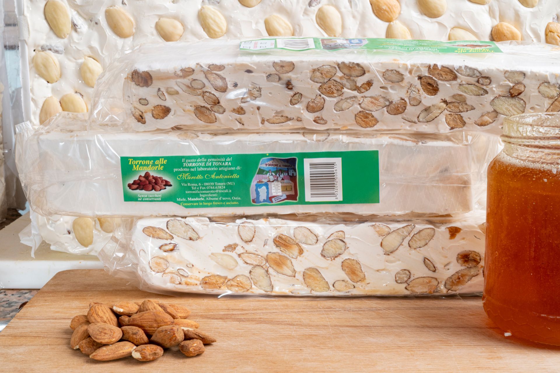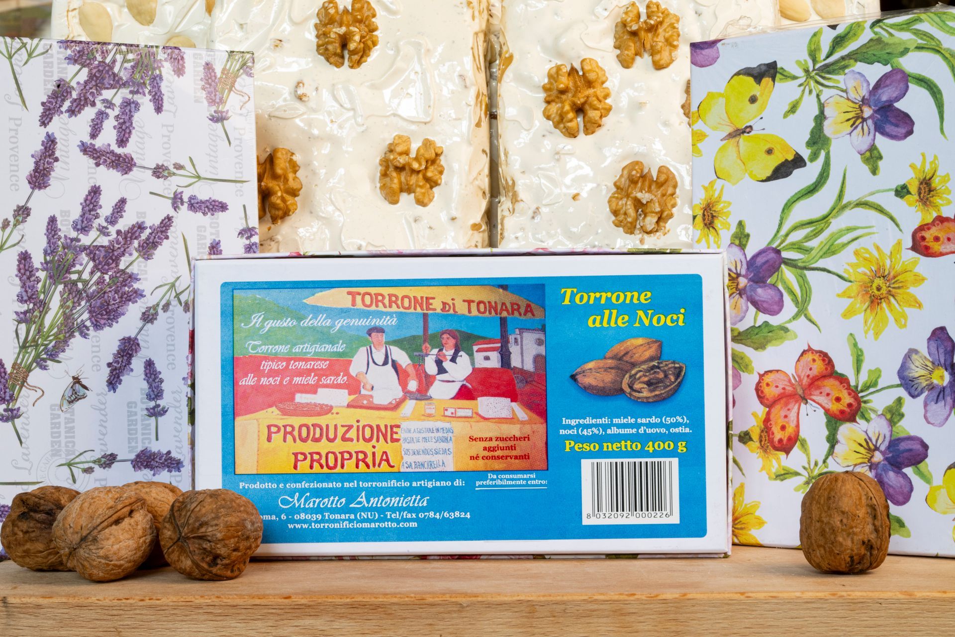 Il torrone alle noci di Tonara, realizzato secondo la ricetta storica che utilizza miele, albumi e frutta secca selezionata. La disposizione dei prodotti consente di distinguere facilmente le varianti classiche da quelle aromatizzate, valorizzando consistenza, colore e tipologia di frutta secca impiegata.