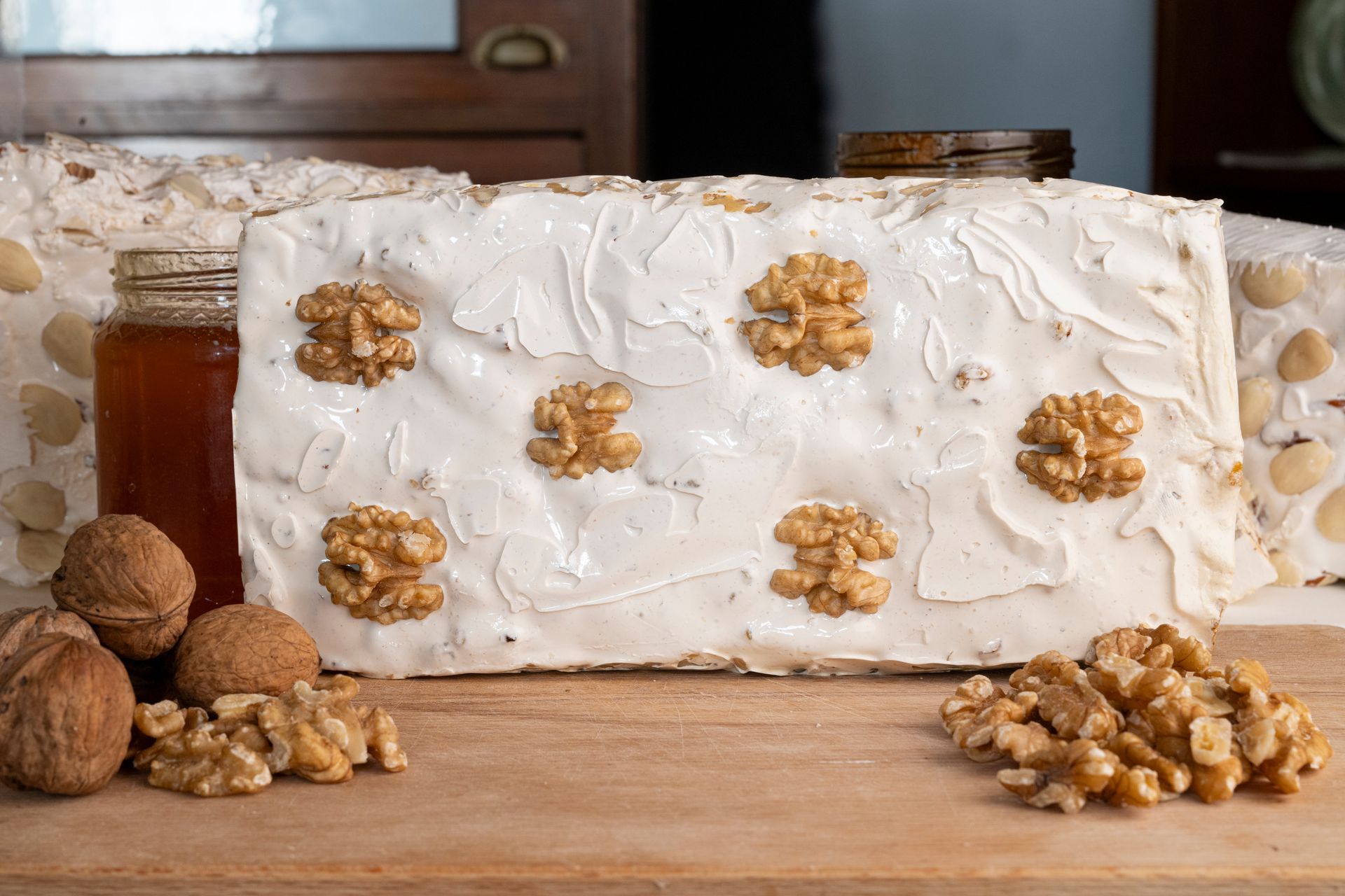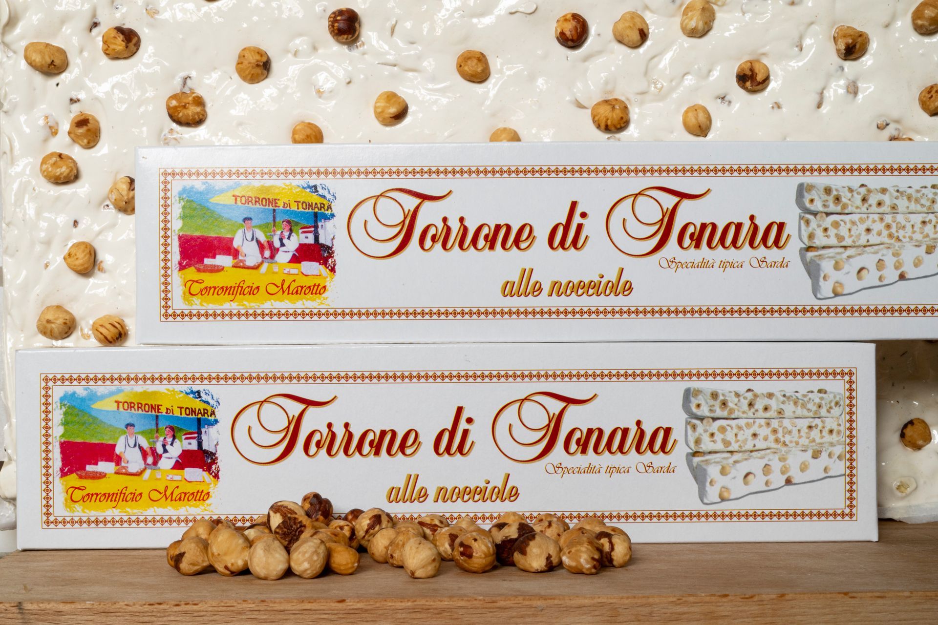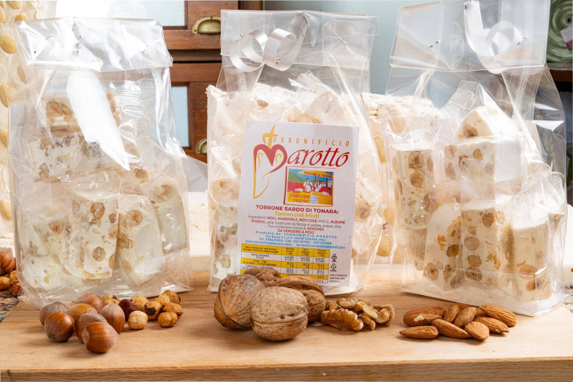 Il torrone alle noci di Tonara, realizzato secondo la ricetta storica che utilizza miele, albumi e frutta secca selezionata. La disposizione dei prodotti consente di distinguere facilmente le varianti classiche da quelle aromatizzate, valorizzando consistenza, colore e tipologia di frutta secca impiegata.