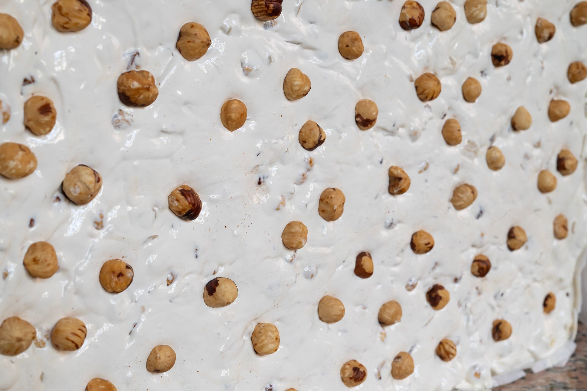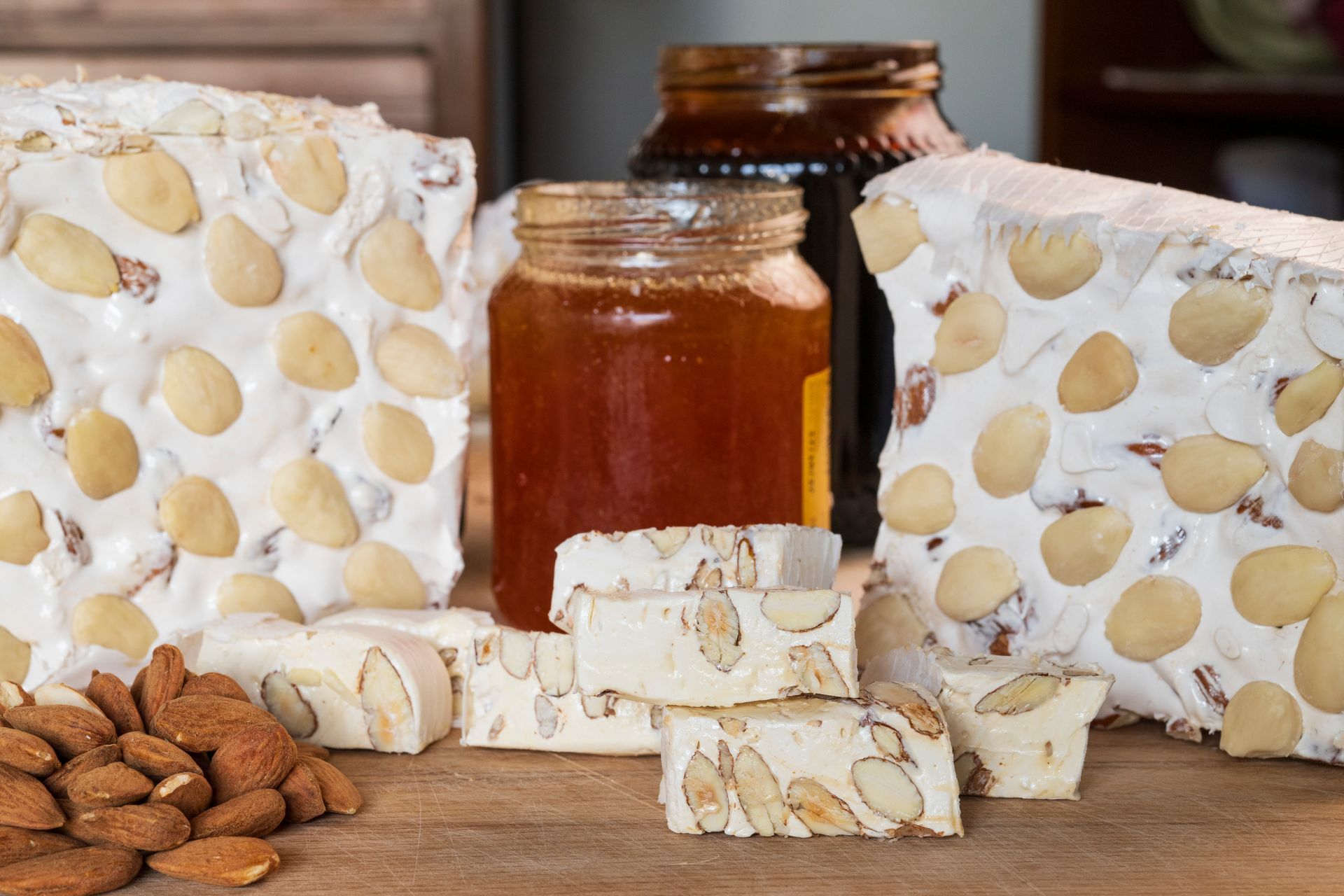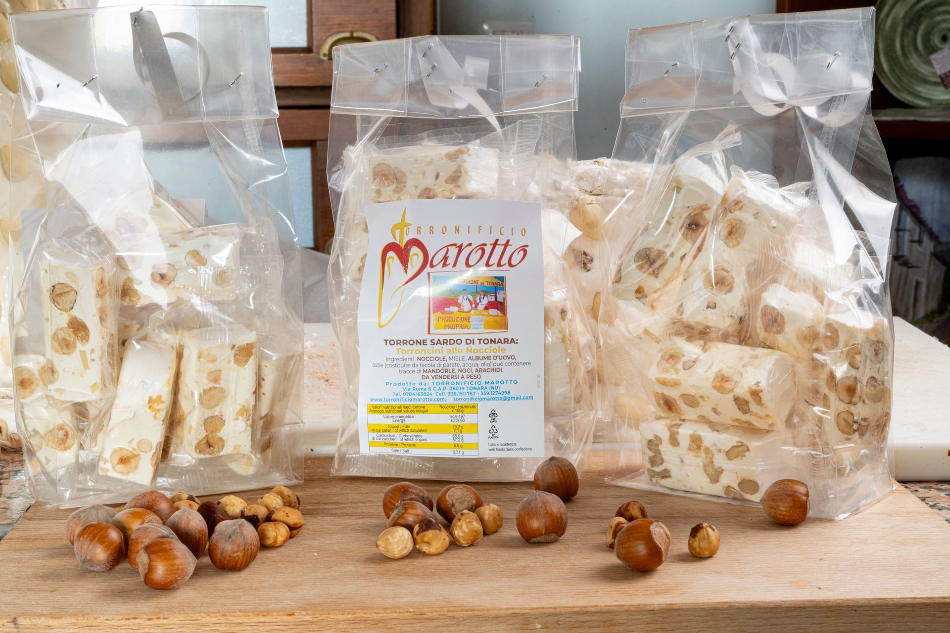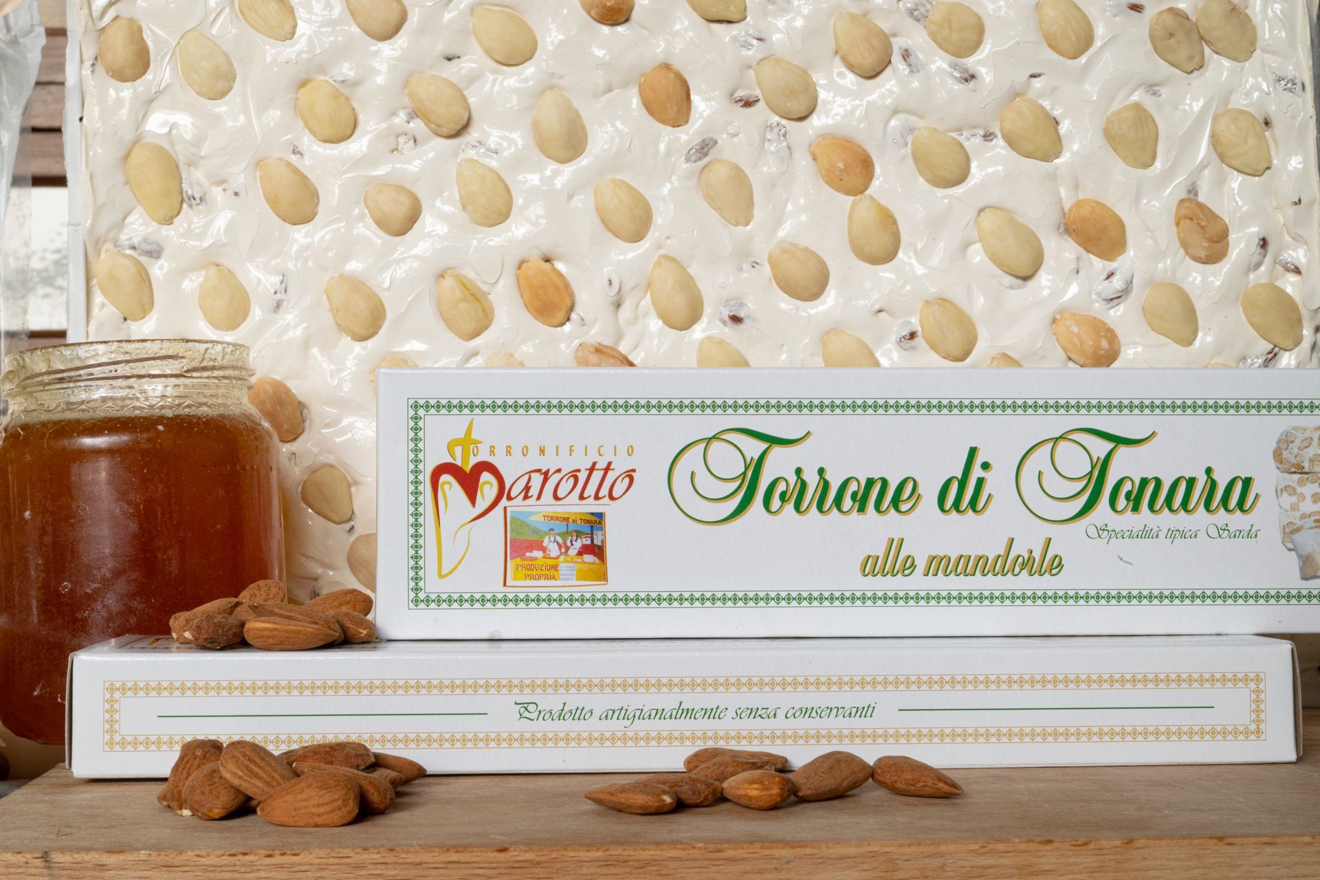 Il torrone alle noci di Tonara, realizzato secondo la ricetta storica che utilizza miele, albumi e frutta secca selezionata. La disposizione dei prodotti consente di distinguere facilmente le varianti classiche da quelle aromatizzate, valorizzando consistenza, colore e tipologia di frutta secca impiegata.